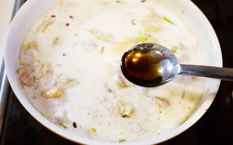 8.鶏肉に9割程火が入ったら、ココナッツミルク、ナンプラーの順に加えます。(ナンプラーが苦手な場合は醤油に適量置き換えてもOK。)ココナッツミルクを加えた後は沸騰させないようにします。全体が温まればつけ汁の完成です。