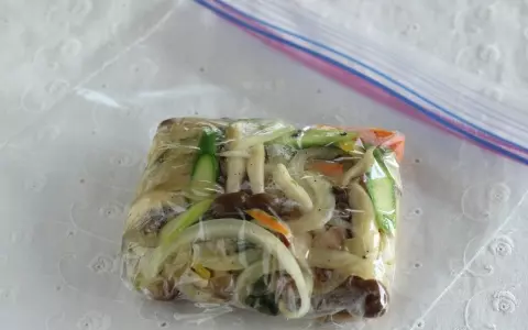 ●野菜炒めは1回分ずつ冷凍保存!さっそく、冷凍保存のコツをご紹介しましょう。難しいことは何もありません。いつも作っている野菜炒めを1回分ずつ小分けにラップに包み、ファスナー付ビニール袋に入れて冷凍保存するだけです。
