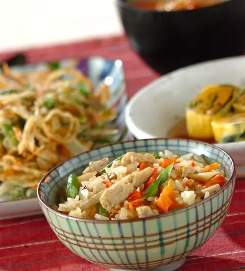 今日の献立は女性に優しい食材をたっぷり使った「根菜入り炊き込みご飯」