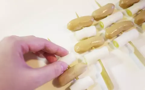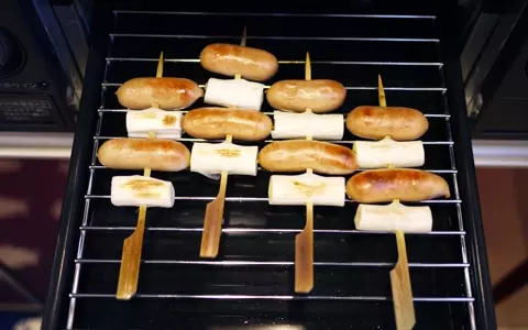 3.竹串にウインナーとネギを交互に刺します。(まな板の上に具を置いた状態で串を刺すと、ずれにくく刺しやすくなります。)