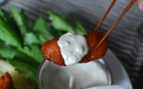 バッファローウィングの特徴は、このセロリとブルーチーズのソース。本場アメリカのレシピはもっとソースも高カロリーでコッテリしているけれど、今日はヘルシー&簡単に作るオリジナルレシピに。