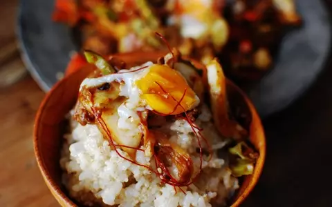 温泉卵をつぶして、絡めて…甘辛味で、なんともご飯が進む! ポイントは八丁味噌。無ければ赤味噌や普通の味噌でもいいけれど、やっぱりこのコク深い味わいは、八丁味噌のなせる業だ。