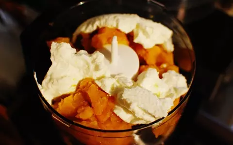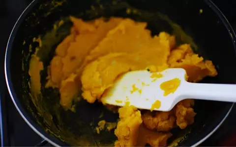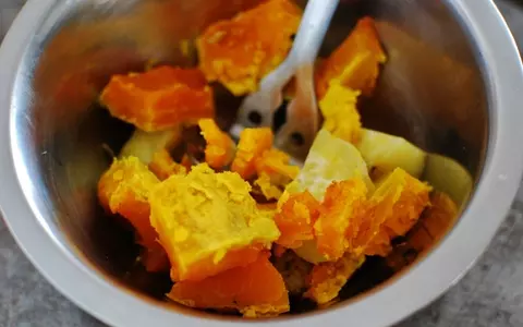 2. かぼちゃとさつまいもの皮を剥ぎ、実をボウルに入れてマッシャーで潰す。