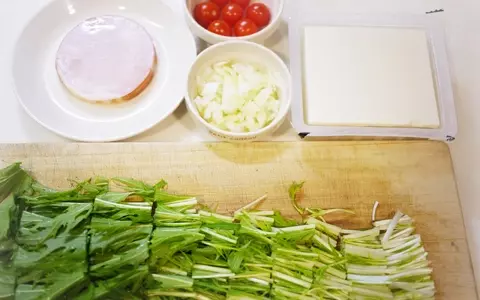 01.まず、玉葱はみじん切りにして塩もみをしておきます。水菜は食べやすい大きさに切り、豆腐はよく水気を切っておきます。(彩野菜として、ミニトマトやパプリカ等があればお好みで用意して下さい)