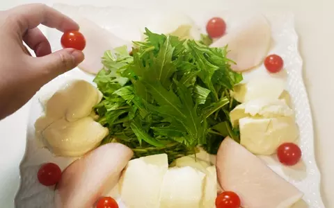 03.豆腐は包丁で切って盛るのも良いのですが、大きめのスプーンなどですくって盛ると、普段とちょっと違った雰囲気が出ます。ハムは少しずらし気味に2つ折りにして盛るだけでもOK。