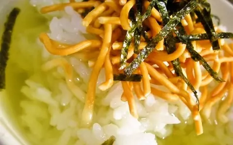 最後に海苔を散らしてお茶をかければベビースター茶漬けの出来上がり!! ちょっとした工夫でお菓子が食事に変身だ。