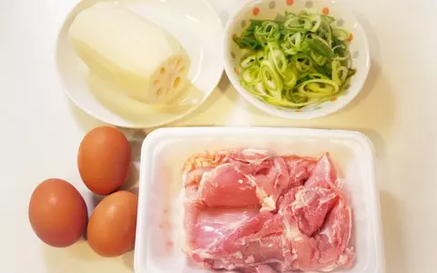 1. まず、材料を準備します。レンコンは皮を剥き、薬味はお好みで刻んでおきます。