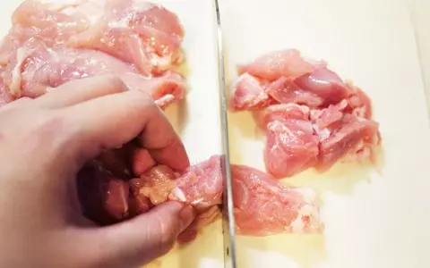 2. 鶏肉は今回もも肉を使用しましたが、胸肉でもOKです。厚みが均一でない場合は厚い部分をそぎ切りして開きます。全体をフォークで刺して穴をあけたあと、一口大に切り、分量外の塩を少量ふって揉み込みます。