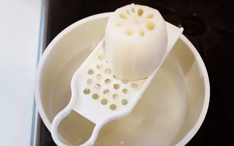 3. レンコンは水を入れた鍋の上ですりおろします。(特に白だし等を使ってつゆの色味を綺麗に出したい場合はこの方法が酸化しにくく、おすすめです。)