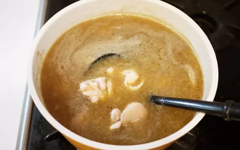 5. 粉末だし、麺つゆ、鶏肉を加えて中火で加熱します。(生姜を入れているため味付けは普段より少し薄めでOK。)沸騰してきたら灰汁をとり、香りがとぶため灰汁をとった後は弱火にし、沸騰させすぎないようにします。