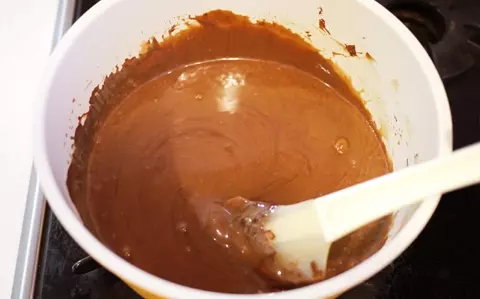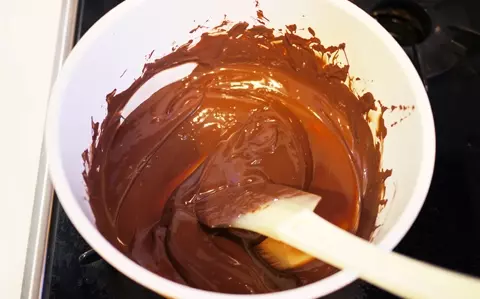 5.(混ぜる道具は終始ゴムベラがおすすめです)鍋にチョコを入れたら、最弱の弱火で絶えず混ぜながら溶かします。焦らずゆっくり溶かして半分近く溶けたところで火を消し、余熱で溶かし切ります。(※加熱しすぎによる分離に注意)