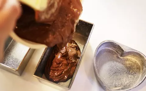 8.(ここまできたら、オーブンを170度に余熱しておきます)生地を型に流します。流すときは少し高い位置から細く流すようにすると、余分な気泡が抜けて仕上がりが綺麗になりやすいです。生地を入れた後は、少し高い位置から台の上などに型を落として気泡を抜きます。表面がだいたい平らになればOK。