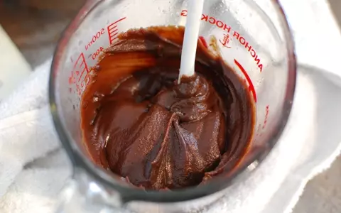 ※湯煎の湯は沸騰させないように! 大体50~60度くらいの温度でゆっくり溶かすこと。時々混ぜながら、温度が高くなりそうなら湯煎からはずして余熱で溶かす。