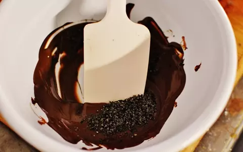 チョコが完全に溶けたら黒すりゴマをいれ、よく混ぜる。