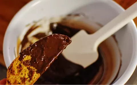 9.ビスコッティの片面の表面に8のチョコを塗りつけ、仕上げに白いりゴマをトッピングする。