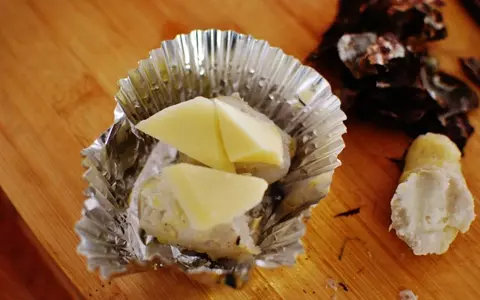 6. 2のサトイモは皮を剥き、アルミカップに入れて塩を全体にし、チーズをのせてトースターでチーズが溶けるまで焼く。焼けたら仕上げに黒胡椒をふる。弁当箱に入れる。