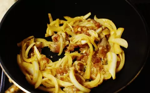 5. フライパンにごま油を熱し、1を漬け汁ごと入れて玉ねぎが透き通り、汁気がなくなるまで炒める。器に出して冷ましておく。