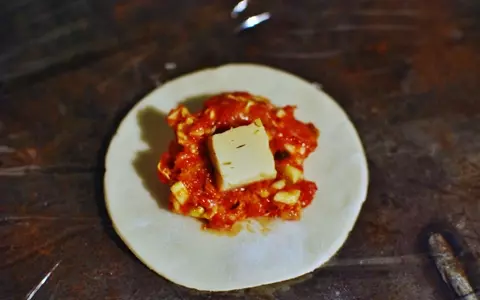 2. 餃子の皮の上に、1を適量のせ、その上にチーズをのせる。