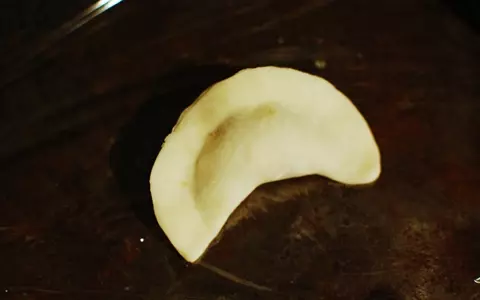 3. 餃子の皮の周りに水をつけ、空気が入らないようにピッチリ半分に折る。