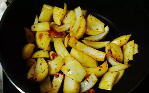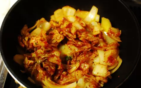 5. 鍋に☆を入れ、弱火で炒める。香りが立ってきたら中火にし、玉ねぎ、キムチを入れて炒め玉ねぎが透き通ってきたら酒を回しいれる。