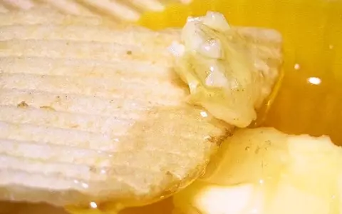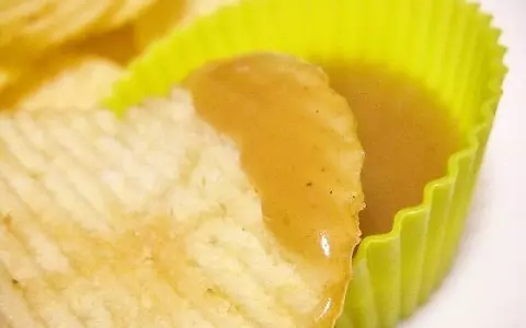 続いてはちみつ&バター。バターは写真では固形だが、ディップする前に少しレンジなどで温めて、溶かしバターを混ぜた方がより美味しい。ポテチの塩と蜂蜜の甘さ、バターのコクが合わさって甘じょっぱいのが好きな人にはぴったりだ。