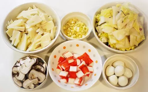 1. まず、筍と椎茸は食べやすい大きさと薄さに切ります。カニカマは3等分に切ります。ニンニクと生姜はみじん切りに、浅漬けは食べやすい大きさに切って水気を絞っておきます。