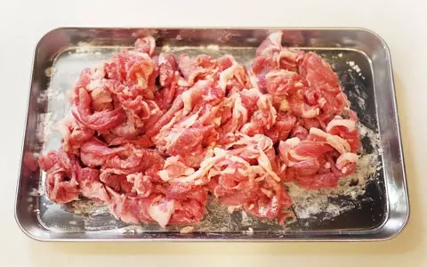 2. 豚肉は薄切りでも細切れでもOKです。分量外の塩を適量ふり下味をつけた後、片栗粉を全体にまぶしておきます。