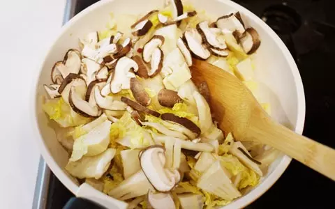 3. あとは加熱し、味付けするだけです。ニンニクと生姜をゴマ油で炒めて香りが出たら、浅漬け、筍、椎茸を加えて炒めます。