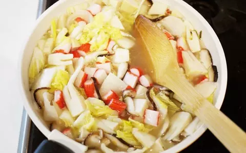 4. 全体に火が通ったら水、カニカマ、オイスターソースを加え、具がやわらかくなるまで加熱します。
