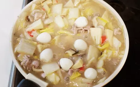 5. 2の豚肉を加えてよく混ぜながら加熱します。火が通ったらうずらの卵を加えて完成。
