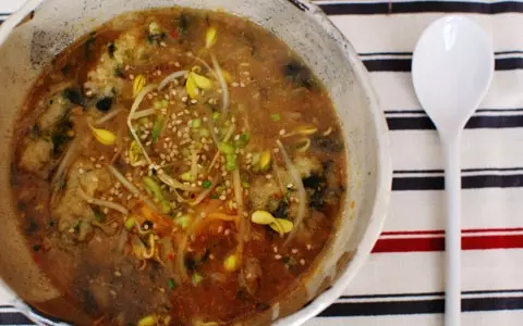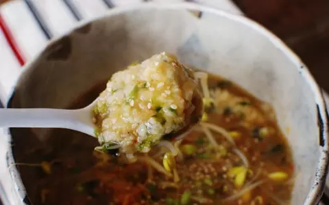 ボリュームたっぷりでヘルシーな食事スープ。もやしは火を通しすぎず、シャキシャキ感が残るように仕上げるのがポイント。自然薯だけで作った団子は、モチモチの食感で小麦粉を使っていないのにすごい食べごたえがある!