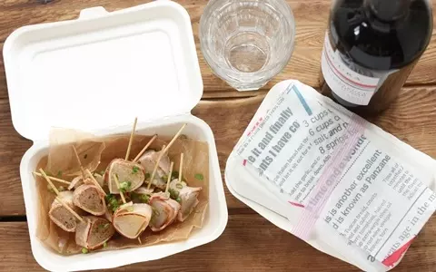 今回、入れ物に使ったのは紙のフードパック。使い捨てできる容器に入れて行くと、持ち運びが楽です。紙ナプキンを添えて、マスキングテープで止めれば、オシャレな持ちよりおつまみの完成!