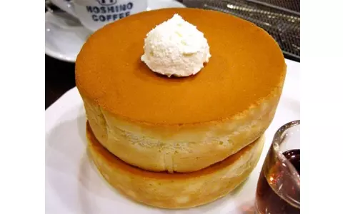 星乃珈琲店の窯焼きスフレパンケーキ(ダブル)です。この分厚さ、目にもおいしい! ふわふわ感が想像できそうですね。メープルシロップをたっぷりかけて、いただきたいです。