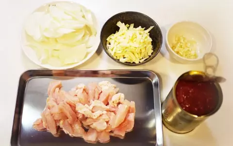 1. まず、ニンニクはみじん切り、玉葱は2~3mmのくし切りに。鶏胸肉は余分な水分を取り除いたあと、ペンネとだいたい同じくらいの大きさになるように拍子切りに。トマト缶はホールトマトの場合は適度に潰す。チーズの種類はなんでもOKですが、とろけるタイプがお勧め。