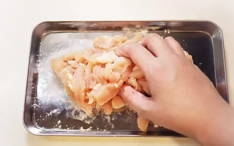 2. 切った鶏胸肉には片栗粉をふって全体的によく塗しておく。別鍋にお湯を沸かし、塩(お湯1Lに対して大さじ1杯程度)を沸騰直前に入れ、ペンネも茹で始める。 (ソースのめどがたってから茹でてもOK)