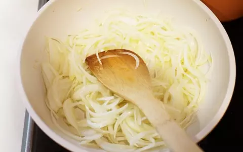 3. フライパンにオリーブ油、ニンニク、玉葱を入れてかるく混ぜてから火をつける。玉葱全体がしんなりして少し色づく程度まで中火~弱火でよく炒める。(時間がある場合は、じっくり長時間炒めると味わいがより深くなりまる)