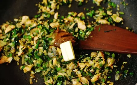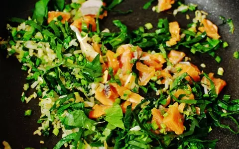 2. 水分が飛んだら、鮭の切り身とほうれん草の葉の部分を入れ塩・胡椒をして炒める。