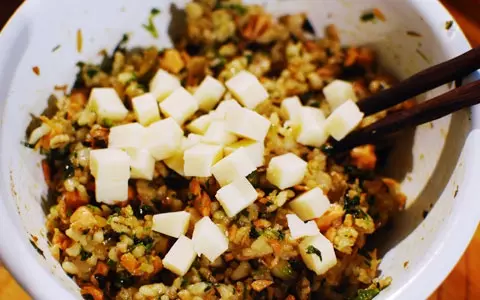 4. ボウルにご飯をいれ、3を入れてしゃもじで切るように混ぜ合わせる。さらにチーズを入れて全体にいきわたるように混ぜる。