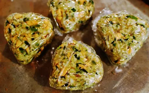 5. 4等分にしてラップなどに包んでおにぎりの形に握る。