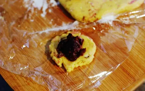 6. 4の餡子を大さじ1強ほど取り、丸める。4の生地で包んで丸くまとめる。(手にくっついて作業しにくい場合は、打ち粉(薄力粉)を少々して作業する)