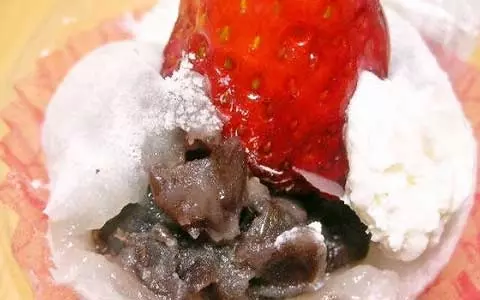 まず1つめは「あんこや 純生クリーム苺大福(¥150)」。大福餅の白といちごの赤の色合いがとてもきれい!生クリームもトッピングされており和洋コラボなスイーツだ。