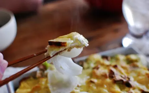 甘い新野菜たちは、加熱するとさらに甘みを増します。フワフワの卵の部分と湯葉は焼けたところが面白い食感に。チーズとの相性もバツグン!