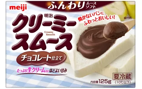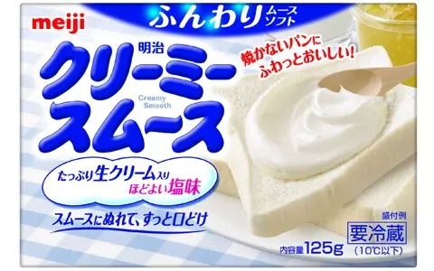 それは、「明治クリーミースム~ス」。これはふんわりとした食感とクリーミーな口どけが特長の焼かないパンにぴったりのスプレッド。ムースタイプだから、トーストしていないパンにもスムースに塗れてとっても嬉しい。これから暑くなる季節には冷やしたパンにも使えてもっと嬉しいかも。