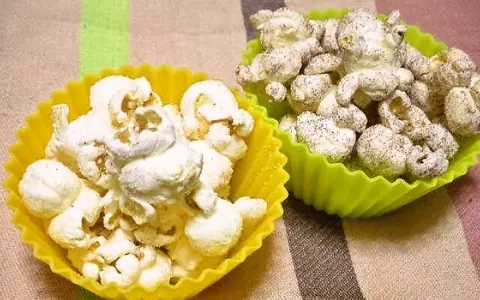 そして出来上がったのがこちらのポップコーン。左が梅昆布味、右がカフェモカ味のポップコーンだ。