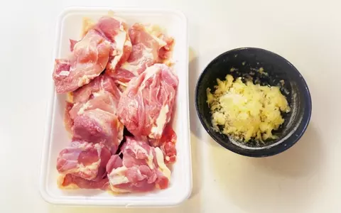 1.まず、鶏肉はフォークで両面をまんべんなく刺した後、少し大きめに切ります。生姜、ニンニクはすりおろします。