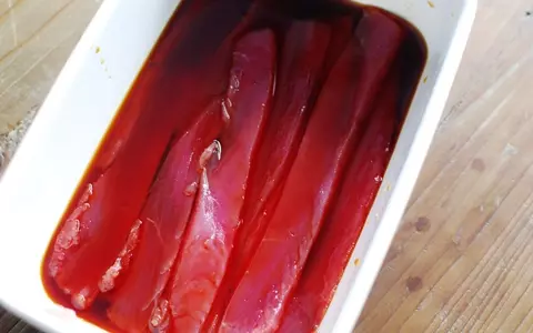 作り方1. マグロのサクは、縦に5mm幅に薄切りにする。容器に☆を入れて最低30分漬け込む。(一晩置いてもOK)