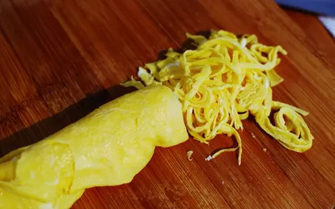 出来た薄焼き卵は重ねて端から丸め、4mm幅くらいの細切りにしておく。