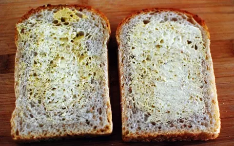 <当日の朝>4.パンは2枚ずつ重ねて軽くトーストする。(好みで、焼きたくない人は焼かなくてもOK)焼いたパンの焼き目が付いていない側に◎を塗る。