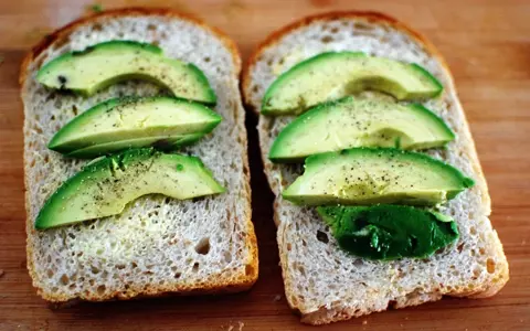 5.アボカドはレモン汁をふりかけて変色止めしておく。パン2枚の上にアボカドを並べる。