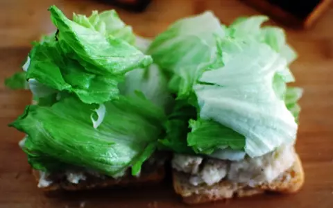 7.その上にちぎったレタスをたっぷりのせ、残りのパンで蓋をする。
